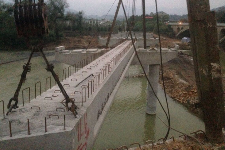 下午16時(shí)30分,公司下屬機(jī)械分公司副經(jīng)理朱超群、該項(xiàng)目部經(jīng)理汪承亮下達(dá)開(kāi)始架梁的命令?,F(xiàn)場(chǎng)頓時(shí)掌聲雷動(dòng),禮花飛舞。在雙滑輪組的勻速滑輪中,空心板梁被緩緩?fù)扑偷轿?,徐徐降落固定,?jīng)過(guò)近40分鐘的精心操作,S347炎陵石潮至壟下公路新河漠大橋4#-5#墩5-3#空心板中梁順利架設(shè)成功。